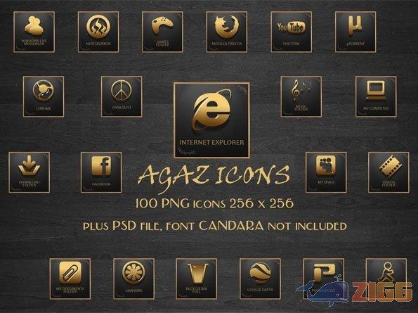 O pacote Agaz Icons foi desenvolvido especialmente para você, elegante e sóbrio ele traz mais de 100 ícones com os programas e serviços online mais populares da net: Youtube, Mozilla Firefox, Internet Explorer, My Space, Facebook, Google Earth, Windows Live Messenger, AIM. Isso além de ícones para atalhos presentes da área de trabalho de todo mundo como lixeira, meu computador e meus documentos.