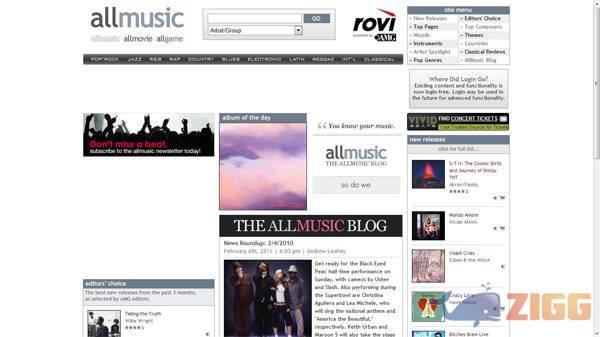 O Allmusic é uma enciclopédia bem diversificada e gratuita da música, onde você fica sabendo de detalhes da vida e obra do seu artista em poucos cliques. O único inconveniente é que ainda não há versão noutro idioma que não o inglês.