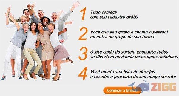 Você só precisará acessar o site e cadastrar seu perfil, depois criar um grupo e iniciar a brincadeira. Convide seus amigos, parentes e colegas de trabalho para se cadastrarem, você como criador do amigo secreto de sua turma irá gerenciar a brincadeira, e poderá aprovar ou não as pessoas que se cadastrarem. Com Amigo Secreto você não correrá o risco de tirar seu próprio nome na hora do sorteio, sua brincadeira ficará muito mais animada.