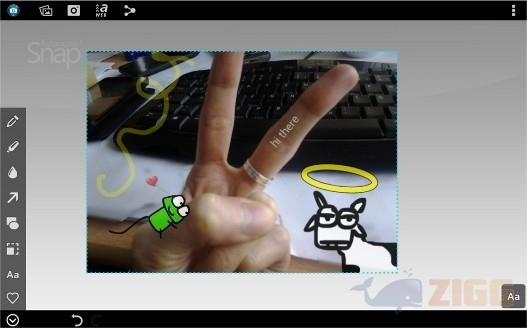 Com a ponta do dedo, desenhe livremente um formato qualquer, ou se preferir use uma combinação entre indicador e plegar para afastar ou aproximar a imagem, criando um zoom. O mesmo mecanismo é empregado para girar a imagem na horizontal ou vertical. Tocando nas opções do canto inferior você abre um conjunto de ferramentas de edição como canetas, marcadores, recorte, texto e várias outras.
