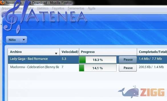Muitos usuários passam horas e horas pesquisando músicas pela internet. De site em site vão navegando atrás de seus sons, e por isso acabam levando muito tempo em suas pesquisas. O Zigg te apresenta o que poderia ser chamado de “o Google da música”, segundo seus desenvolvedores: o buscador de música Atenea. O programa faz uma varredura na internet atrás de suas canções preferidas para em um clique você as tê-las em seu computador. Sem precisar perder muito tempo entrando em diversos sites para fazer a pesquisa.