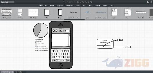 Com o programa aberto você já tem alguns wireframes imagens com um estilo diferente que dão um toque a mais quando você está realizando seus projetos. Eles estão todos localizados em uma barra de rolagem horizontal, mais se prefirir podem ser acessados por categorias que ficam logo acima da barra de rolagem, e estão divididos em gráficos, botões, layouts de iOs, textos, alguns layouts.