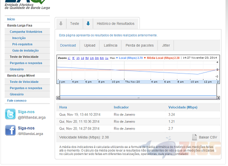 É possível acessar, depois de finalizado o teste, um gráfico que mostra como foi o desempenho da sua conexão. Para isso, basta clicar em “histórico de resultados” e selecionar uma das seções testadas para verificar a tabela. Caso queira baixar o resultado em forma de documento, selecione a opção “baixar CSV” para ter o arquivo com todo o relatório.