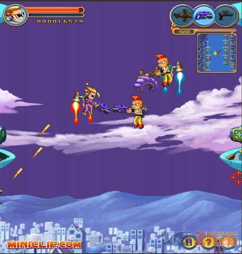 Elimine os inimigos para ganhar novas armas. Algumas delas possuem diferentes características como mísseis, granadas, lasers e disparos simultâneos. Você pode ainda entrar nos tanques de guerra, naves e foguetes espalhados pelo caminho.