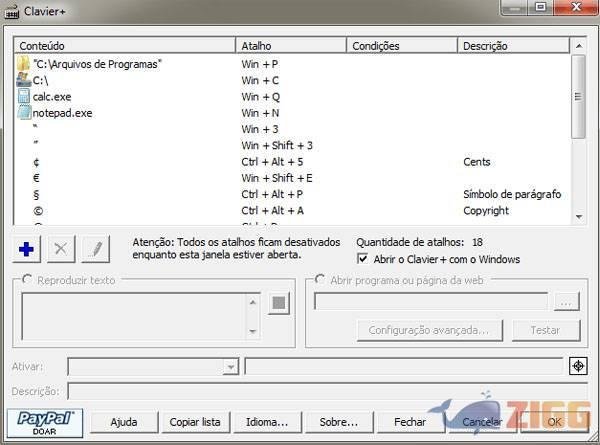 Depois de executar o programa alguns atalhos já estarão predefinidos, contudo você poderá modifica-los do jeito que for melhor para você. O aplicativo permite inserir atalho para executar um programa, abrir uma pasta ou mesmo inserir um caractere ou frase que geralmente você utiliza em um editor de texto ou caixa de e-mail.