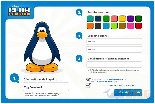 Criar seu personagem no Club Penguin é muito fácil. Basta clicar em nosso botão de download para acessar automaticamente a página do jogo da Disney. Você pode então, com a ajuda de um adulto, criar seu próprio pinguim com a ajuda de um email de um responsável pela conta.