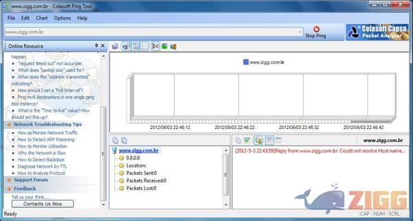 Como já mencionado, para fazer o teste dos endereços é só digitalizá-lo no campo da parte de cima da tela. Depois disso, clique em Start Ping e espere pelo resultado. Você poderá acompanhar cada ping em tempo real através do gráfico exibido pelo programa.