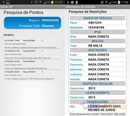 A pesquisa do aplicativo permite verificar informações do seu veículo ou de outros; ver pontos na CNH; solicitar a segunda via da carteira de habilitação; e acompanhar seus pedidos. Através do Detran.SP você não só agiliza os serviços como também pode finalizá-los pelo próprio aplicativo. Um exemplo é a pesquisa dos pontos na carteira que já mostra o local onde a multa foi aplicada, quantidade de pontos recebidos e o motivo.