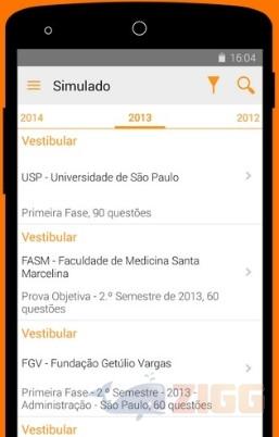 A segunda funcionalidade é uma série de simulados. Esses simulados são, na verdade, provas de anos passados, de universidades como a USP e a FGV.