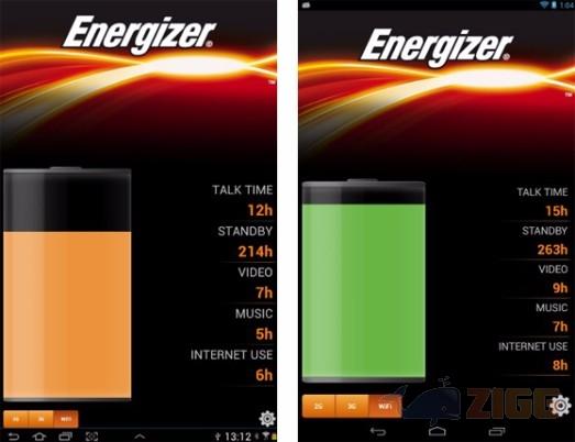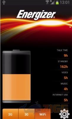 A tela inicial do Energizer exibe o tempo restante de baterias em hora para cada tipo de atividade (ver vídeos, ouvir músicas, usar a internet, falar ao telefone etc.) Quanto ao uso da internet, ele também pode fazer o cálculo levando em conta redes wi-fi, 2G e 3G.
