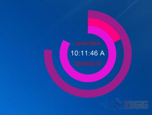 O Eusing Clock é capaz de deixar o seu computador mais atraente com este colorido relógio para a área de trabalho que foge aos padrões. Neste gadget a hora é marcada de duas formas, um relógio digital ao centro e uma imagem formada por três círculos coloridos que se movimentam para indicar as horas, minutos e segundos. Este relógio grande para a tela do computador é ideal para quem tem dificuldade para enxergar as horas naquele relógio pequenininho da barra de tarefas.