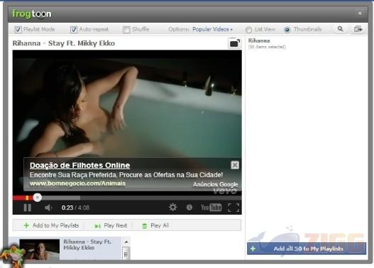 Após concordar com os termos de uso do Frogton Music você encontrará uma imensa variedade de músicas cadastradas e seus respectivos vídeos. Você poderá escolher um gênero em ‘Music Genres’ – Blues, Country, Rap, Reggae, Hip Hop, Pop, entre outros. Infelizmente, por se tratar de uma ferramenta em inglês, gêneros brasileiros como o Samba não podem ser encontrados.