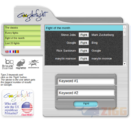No menu do lado esquerdo do site você escolhe ver ‘embates clássicos’, como Luke Skywalker contra Darth Vader, caneta versus espada e Deus versus Satã. Comparações engraçadas ficam registradas em ‘Funny Fights’. O Googlefight seleciona comparações engraçadas em ‘Fight of the Month’ e registra as últimas 20 lutas em ‘Last 20 Fights’.