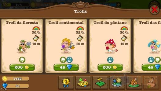No início do jogo você passará por um tutorial ensinando como construir novas casas, fazer alimentos entre outras dicas. Siga a seta amarela para aprender os comandos iniciais e não fazer feio na partida. Compre seu primeiro troll, para dar início a sua primeira casa. Construa mais casas para que a cidade cresça, vá até a mina ou a área de cortes para conseguir diamantes, rochas e madeiras, para acumular matéria prima e aumentar a produção.