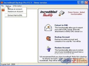 IncrediMail Backup PRO é um programa que pode fazer backups de forma extremamente fácil em seu correio eletrônico. Ele pode extrair seus emails do Incredimail no formato EML, incluindo todos os seus anexos. O software também torna possível importar seu correio incredimail para outros programas de email, e também permite restaurar todos os correios eletrônicos que você já tinha removido.