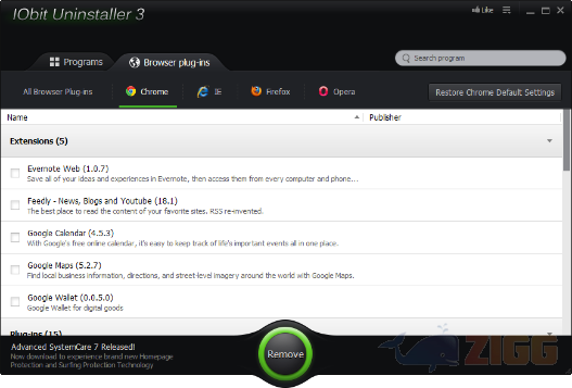 Uma novidade desta versão do IObit Uninstaller é que os Plug-ins dos seus navegadores são listados em uma aba dedicada independente, sendo exibidos em sua totalidade ou divididos por cada browser, o programa informa até mesmo o grau de segurança destes plug-ins, notificando qualquer ameaça em potencial que possa estar escondida no seu navegador.