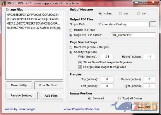 Para iniciar o processo, clique no botão Add Files para importar as imagens que você deseja converter. É possível organizá-las ou removê-las através dos botões ‘Move Sel Up’, ‘Move Sel Down’ e ‘Remove Selected’. Todas os arquivos importados ficam listados no campo ‘Image Files’. Para iniciar o processo de conversão, clique em ‘Save PDF’. Por padrão, o programa salva as imagens convertidas na área de trabalho. Mas você pode alterar a pasta de saída no campo ‘Output Path’.