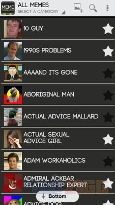 Criar seus memes no Meme Generator Free é bem fácil e descomplicado. Ao abrir o aplicativo você já visualiza uma lista com as imagens de memes que você pode usar. Na barra superior da interface do app você pode escolher as categorias de memes para ver ou buscar pelo nome da imagem desejada. Note que, ao lado de cada meme há um ícone de uma estrela, que serve para você marcar os seus favoritos e facilitar na hora de criar novos memes.