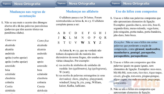 Em “trema”, você poderá ver a alteração feita nas palavras que usam esse sinal e verá uma lista do antes e depois após a reforma ortográfica. “Regras de acentuação” mostra o que mudou em relação aos ditongos abertos e palavras pares, por exemplo. Também podemos verificar sobre a utilização do hífén. Algumas sessões possuem bastante conteúdo que podem ser lidos deslizando o botão na vertical.
