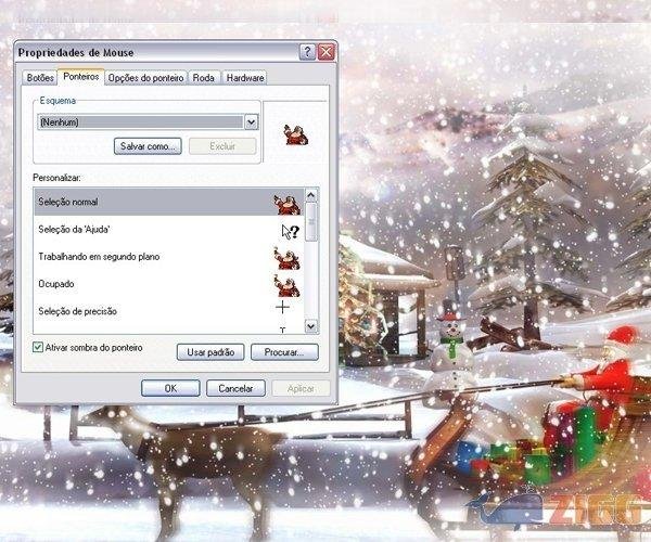 Ao executar o arquivo “Christmas Theme.msi“, instale o aplicativo normalmente como qualquer outro. Depois que terminar a instalação o programa modifica seu cursor, seu papel de parede, descanso de tela e ícones automaticamente. Para mudar o cursor vá em Iniciar > Configurações > Painel de Controles > Mouse > na aba Ponteiros você verá os cursores disponíveis.