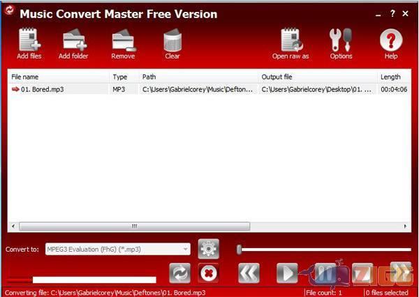 Este utilitário de conversão de áudio permite converter arquivos entre WAV, OGG, MP3, MP2, RAW, WMA, VOX, MPC, MP +, e outros formatos well-known. Music Convert Master possui uma interface muito bonita e intuitiva, bastando que o usuário clique em “Add file” para adicionar uma musica especifica ou adicione uma pasta completa para conversão.