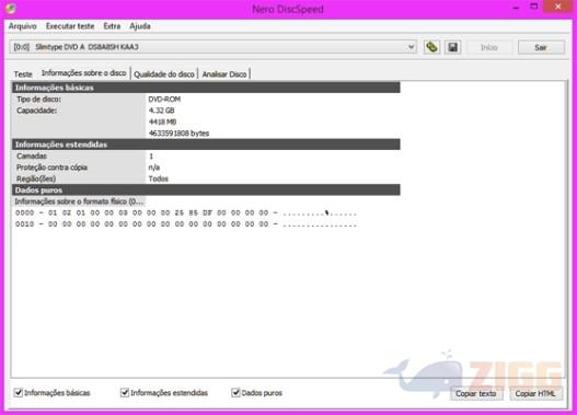 Informações básicas como tipo de disco, fabricante, MID, velocidade de gravação, capacidade e status de disco ficam na opção “Informações sobre o Disco”.