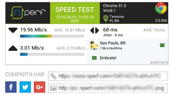 O nPerf exibe a taxa de download em Mb/s, taxa de upload e latência, bem como detalhes sobre sua rede como o operador, tipo de conexão, endereço IP, navegador e sistema operacional utilizado durante o teste. Clique em “Compartilhar” para salvar o relatório ou compartilhar diretamente nas rede sociais.