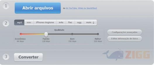 São apenas três passos para ter um novo arquivo de áudio no formato que você precisa. Clique em ‘Abrir Arquivos’, selecionando do seu computador um arquivo de áudio em qualquer formato ou de vídeo em MP4, M4A e OGG. Nesta opção também você pode inserir um link do Youtube, Vimeo ou SoundCloud para extrair o áudio do vídeo que deseja.