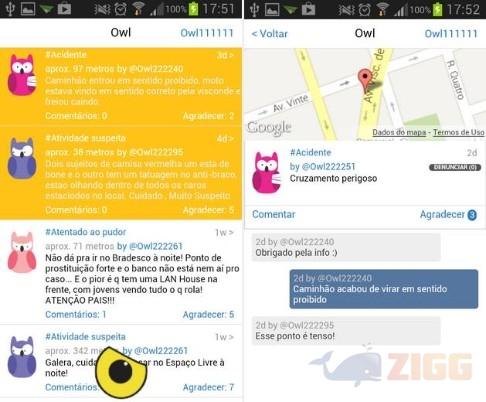 Ao clicar no seu nome, você pode aumentar a visão do seu Owl de 500m para distâncias maiores ou simplesmente tudo! Ao voltar para a tela inicial, serão apresentadas todas as ocorrências registradas por pessoas ao seu redor. Para adicionar um novo incidente, clique no olho da coruja e depois confirme clicando em Sim. Preencha uma descrição e selecione uma categoria como acidente, arrastão, drogas, furtos, homicídio e outras ocorrências, depois clique em Publicar.