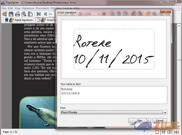Uma janela será exibida após esta ação para que você possa editar a assinatura. Os três modos envolvem assinatura com caracteres digitais, caligrafada ou por meio de uma imagem que contenha sua assinatura ou selo.