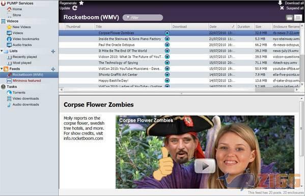 Pump é uma poderosa ferramenta de organização, busca, download, conversão e sincronismo de vídeos em geral. Traz consigo um misto de tudo que é necessário para trabalhar com a maioria dos tipos de vídeo atuais. Busca vídeos por um mecanismo de multi-procura que inclui download, streaming e torrents nos principais canais atuais como Youtube, Dailymotion, Google, Legaltorrents e outros por meios de abas, como em um navegador.