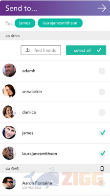 Depois de escolher a música, você pode adicionar uma foto, vídeo ou um dos divertidos emojis do app à sua mensagem. Basta seguir as instruções do tutorial inicial do app. Depois disso você pode escrever algo na mensagem e enviar para seus amigos do Rithm. Você também pode enviar o link da sua mensagem para amigos que não tenham o aplicativo, por SMS, bem como compartilhar o link para sua mensagem no Twitter, Facebook, Whatsapp e outras redes sociais.