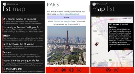 A aparência e a funcionalidade do aplicativo Wikipedia para Windows Phone se destaca em relação às demais versões para Android e iOS, expondo mais direta e claramente opções de pesquisa e interação ao usuário.