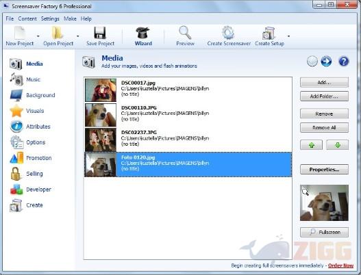 O programa possui vários recursos interessantes, porém requer um pouco de atenção, pois está todo em inglês. Para começar a criar seu novo descanso de tela, clique em new Project. Em seguida clique em add e escolha as fotos que você pretende usar para fazer o descanso de tela. Do lado esquerdo do programa você terá acesso a um menu, nele é possível criar efeitos, adicionar sons, alterar as sequências das imagens e muito mais.
