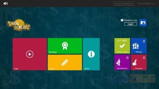 Ao abrir o jogo do Show do Milhão, você terá algumas opções e informações na tela inicial do jogo, como os botões Jogar, Rankings, Inserir e Sobre. Ainda na tela inicial, você terá mais informações sobre as suas participações no jogo em um informativo no lado direito da tela, com o número de perguntas certas, vitórias, desistências e derrotas.