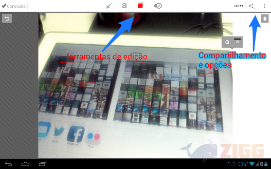 No canto superior direito você encontra, da esquerda para direita, a opção de Compartilhamento, onde você pode escolher redes sociais e ferramentas de envio de mensagens instantâneas para o envio imediato de sua imagem, e o botão de Opções, que lhe dá ferramentas de Giro e Corte de imagem.