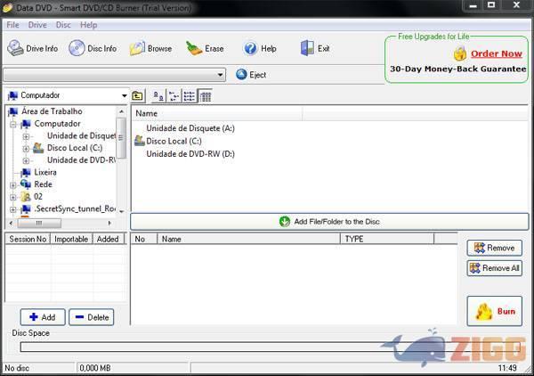 Pronto, ele já está instalado no seu PC. Sua interface é bem simples e lembra bastante o Explorer do Windows. No campo “Computador” você pode navegar pelos diretórios em busca dos arquivos a serem salvos no disco. Em seguida, clique em Add File/Folder to the Disc, removendo os arquivos adicionados erroneamente na opção Remove.