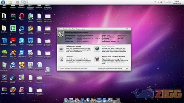 Snow Transformation Pack transforma toda a interface do seu Windows Vista ou 7 para a do MAC OS X Snow Leopard, incluindo sua tela de boas vindas, visual, ícones, sons, docks e muito mais. A mudança é tão radical que você se sente como se realmente estivesse utilizando um MAC, arriscando até mesmo alguns atalhos do mesmo embora não resultem em alguma ação.