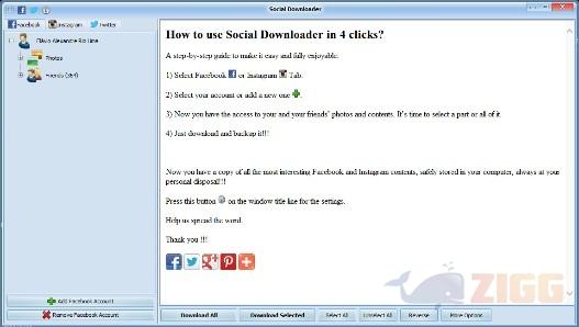 O Social Downloader é uma ferramenta que permite a visualização e backup das fotos em suas redes sociais. O aplicativo se conecta às suas contas e acessa de maneira prática e segura, pois as suas informações de contas não são compartilhadas com ninguém, as suas fotos, de seus amigos e aquelas que você foi marcado, informando inclusive há quanto tempo foram postadas e a quantidade de likes e comentários.