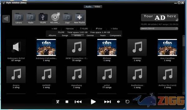O modo de exibição do Style Jukebox é mais fácil de usar, achar e visualizar suas músicas e vídeos. No modo de áudio, você pode ver sua coleção de músicas em categorias: artistas, álbuns, ano, gênero ou compositor. Você pode até mesmo usar a funcionalidade drag and drop ou arraste e solte para copiar os arquivos para um determinado local.