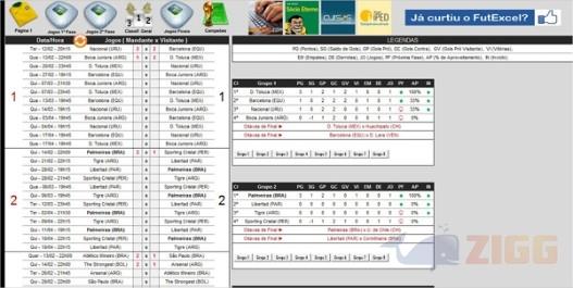 A página inicial da Tabela Copa Libertadores 2013 exibe uma lista com o diagrama da fase de mata-mata do torneio, assim como a lista de grupos na parte superior. Definindo o tipo de Diagrama como Parcial, é possível ver como ficaria a fase final de acordo com as classificações atuais. Selecione seu time preferido para visualizá-lo em destaque em todas as páginas do arquivo.