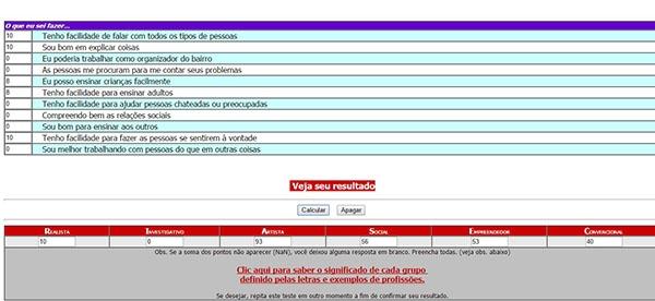 Lembre-se de não deixar nenhuma questão em branco. Ao fim do teste, clique em “Calcular” para ver sua pontuação em 6 grupos diferentes: Realista, Investigativo, Artista, Social, Empreendedor e Convencional. O site informa um artigo explicando o siginificado de cada grupo e quais as profissões relacionadas.