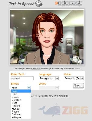 Agindo como um conversor de texto em voz você poderá escrever qualquer frase ou texto que desejar, e logo após clicar em “Say It” para escutar tudo o que você escreveu em diferentes vozes. Esta ferramenta pode ser utilizada como um programa para mudar a voz, mudando totalmente sua pronuncia e gesto de fala.