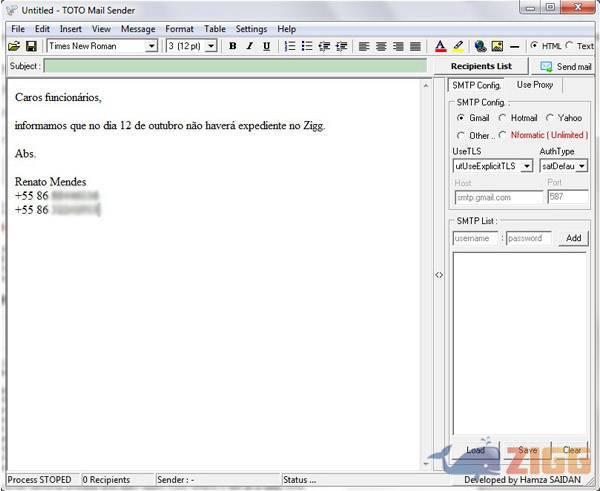 O legal do TOTO Mail Sender é que não é necessária instalação, basta baixar o arquivo aqui no Zigg e em seguida dar um duplo clique sobre ele. A tela do programa se abrirá na edição do email e lá será possível digitar o email que você deseja enviar.