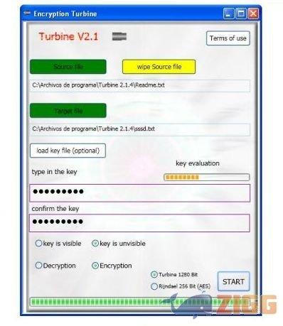 O Turbine codifica qualquer arquivo com o seu próprio algoritmo 1280 bits. Comparado com algoritmos de 128 bits, a proteção do Turbine é muito mais robusta contra ataques criptográficos, pelo menos no papel. Você também pode optar pelo mais convencional AES de 256 bits.