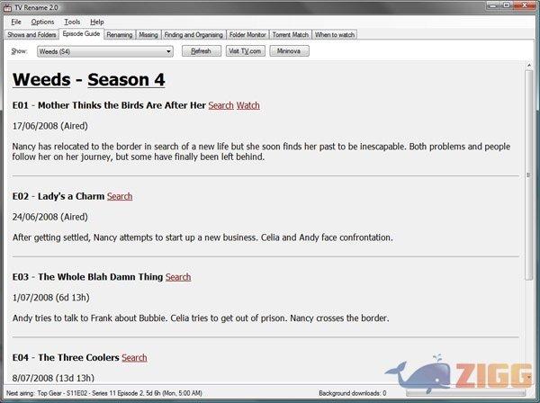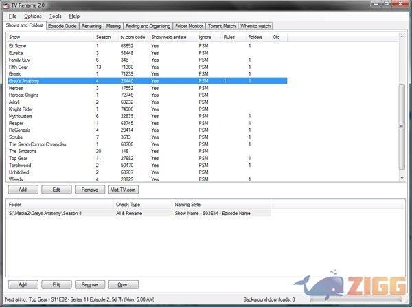 TVRename trata-se de uma versão antiga, mas a idéia é a mesma. O usuário configura os arquivos que estão interessados, e onde se localizam no seu computador. Ele tem as opções de renomeá-los para nomes agradáveis em uma série de estilos selecionáveis. O programa possibilita a leitura dos guias de episódios dos shows arquivados.