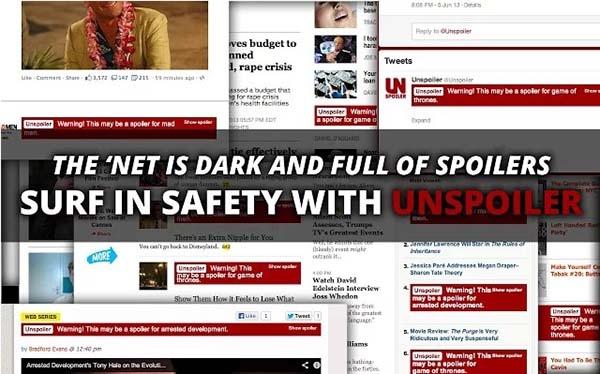 Pensando nisso, foi desenvolvido uma extensão para Chrome que lhe avisa sobre spoilers. Com o Unspoiler, basta informar a palavra chave de um conteúdo que ele identifica automaticamente se a página em que estiver acessando contém assuntos relacionados.