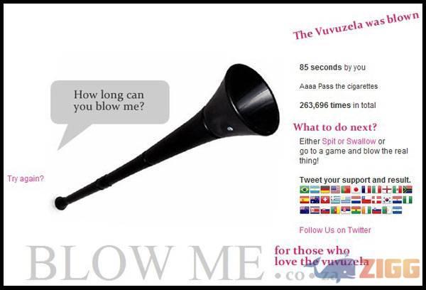 Vuvuzela Online é um serviço web que disponibiliza uma vuvuzela especialmente para você nos jogos. Milhares de pessoas em todo o mundo já experimentaram a novidade. A vuvuzela lhe propõe o desafio “how long can you blow me?” (por quanto tempo você consegue me soprar) e registra seu tempo acompanhado de uma pequena frase de efeito de acordo com o mesmo.