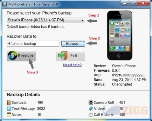 Para recuperar conversas do whatsapp você deve escolher um ponto de backup do dispositivo conectado ao PC na opção “Please select your iPhone’s backup”. Em seguida, escolha uma pasta para armazenamento dos arquivos recuperados e clique em “Recover” para iniciar a recuperação. Ao término, clique em “Open Recovered data” para conferir seus arquivos recuperados.