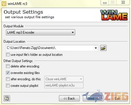 Na tela seguinte é necessário configurar os arquivos de saída. Ao lado de “Output Module”, escolha o formato que será utilizado: LAME mp3 Enconder (MP3), OGG Vorbis Encoder (OGG), WAVE Encoder (WAV) ou Windows Media Audio Encoder (WMA). Em “Output Location”, escolha o local em que serão colocadas as músicas.